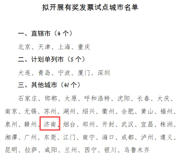 商务部、财政部、国家税务总局1月23日对外公示拟开展有奖发票试点城市名单,济南等50个城市入选。