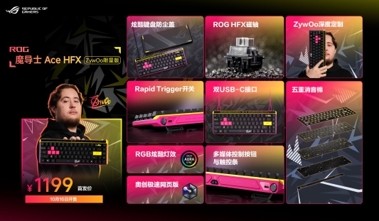 亮点:ZywOo定制联名设计、ROG HFX磁轴、五重消音棉、Rapid Trigger开关、SmartBar触控条