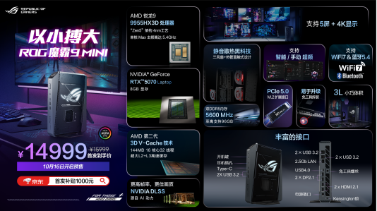 凭借 “小体积、强性能” 广受玩家喜爱的ROG迷你主机,今天为玩家们又送上一份惊喜礼物 —— 全新 ROG 魔霸 9 Mini。首款搭载 AMD Ryzen 9 9955HX3D的电竞迷你主机,9955HX3D拥有 16 核 32 线程,最高加速频率可达 5.4GHz;采用第二代 3D V-Cache 技术,高达144MB的高速二级和三级缓存,堪称移动端处理器性能天花板。搭载的RTX 5070 移动端独立显卡,支持 DLSS 4 AI 帧生成技术,满血性能释放状态下帧率稳定画质上乘。魔霸9 Mini仅仅3L的小巧机身,将美学观感和优化散热风道巧妙结合,同时整机支持免工具开启,拓展维护非常方便。它搭载5600MHz DDR5内存、还拥有PCIe5.0 M.2硬盘接口和WiFi7网卡,为玩家提供超快的数据传输速率。散热方面,ROG 魔霸9 mini 采用全新三风扇+热管直触式散热设计,让热传导效率更高,散热无忧的同时又能稳定安静地运行,运行高负载的3A游戏时噪音也只有微弱的噪音。堪比台式机的丰富接口拉满拓展性,最多支持5个4K显示器输出,还拥有速率高达40Gbps的USB4接口和满血HDMI 2.1及DP2.1接口。魔霸9 Mini强大的游戏性能表现和综合实力。专为追求游戏表现的玩家而生!