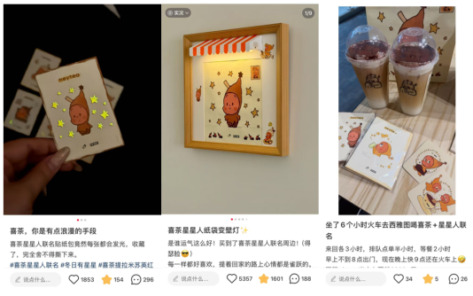 而在联名活动体验中,使用夜光墨水材质、会在夜晚昏暗环境中发光的星星人贴纸,采用流麻工艺的星星人喝茶徽章,以及可以为星星人“戴”围巾的联名杯套……等一系列设计细节,成为众多网友晒单时的重点分享内容。出于对设计的欣赏与喜爱,许多用户开始通过各种改造方式,将饮品杯、纸袋等物料进行二创,“定制”属于自己的联名周边。
