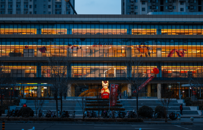 极具辨识度的下沉广场被精心打造为城市级地标打卡点。艺术化的“章丘”字样标识结合精心设计的灯光层次,构筑出融合在地印记与现代美学的公共艺术广场。商场采用 “无边景观”设计手法,通过开放式广场、绿化系统,模糊了商业与城市的边界,其青春打卡区的互动灯光装置更成为延伸商业活力的夜间亮点。
