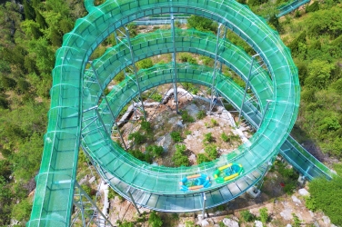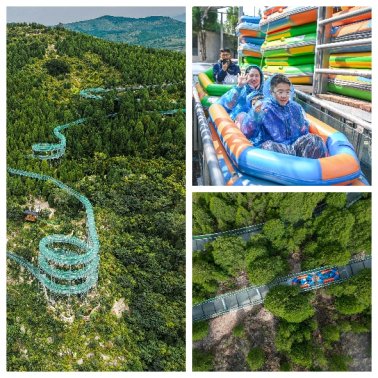 春光正好,放肆撒欢!石崮寨360度云端漂流全线开放,被誉为华北最解压的空中水道,让游客在山水间沉浸式体验心跳与快乐。乘皮筏顺全透明玻璃滑道飞驰而下,全长近2000米、落差近百米,串联十余处360度回旋弯道,穿梭青山密林与烂漫花海之间;乘风破浪俯冲穿梭,水雾在阳光下折射出彩虹,山风裹挟花香拂面,在春日里尽享速度与清凉,尖叫与欢笑一路相伴。